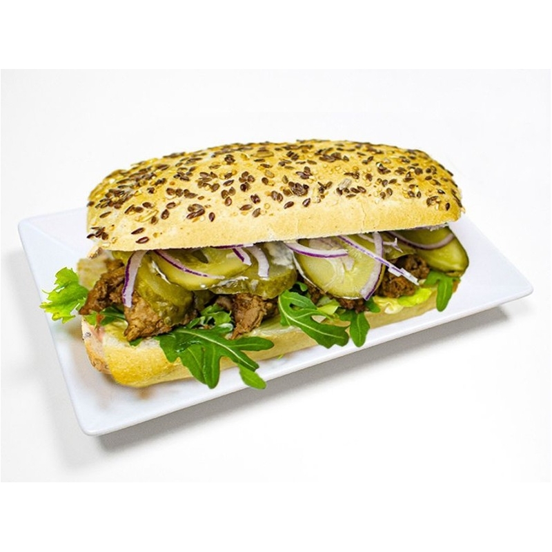Składniki: Bułka pszenna z ziarnami 40,9% (z PSZENICY, gluten PSZENNY, ziarna SOI, ziarna słonecznika, pestki dyni, siemię lniane, płatki OWSIANE), karkówka 24% (karkówka wieprzowa, sos BBQ, olej rzepakowy, musztarda (z GORCZYCĄ), sos sojowy jasny (z SOI), pieprz czarny, sól), sos musztardowo-majonezowy 15,3% (majonez domowy (z JAJ, musztarda (z GORCZYCĄ)), musztarda (z GORCZYCĄ)), mix sałat 8,5% (endywia escarola, endywia frisee, cykoria radicchio, rukola), ogórki konserwowe 5,1% (z GORCZYCĄ), sos BBQ 5,1%, cebula czerwona 1%.