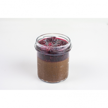 Składniki: budyń jaglany 82,8% (woda, kasza jaglana, Nutella [cukier, olej palmowy, ORZECHY LASKOWE, kakao o obniżonej zawartości tłuszczu, MLEKO odtłuszczone w proszku, serwatka /z MLEKA/, emulgator: lecytyny SOJOWE, aromat], cukier, kakao, cukier wanilinowy [cukier, wanilina]), frużelina z owoców leśnych 17,2% (owoce leśne, woda, cukier, żelatyna).