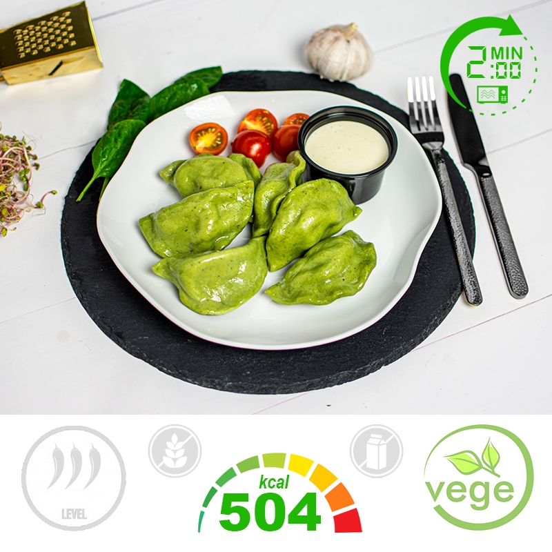 Pierogi szpinakowe faszerowane serem podane z emulsją śmietanową